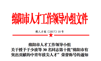 7月5日,綿陽市委、市政府批準授予我公司董事長于少波第十批“綿陽市有突出貢獻的中青年拔尖人才”榮譽稱號。該稱號的授予,充分肯定了于董在加快科技城建設和推進綿陽經濟社會事業發展中所做出的突出貢獻。
